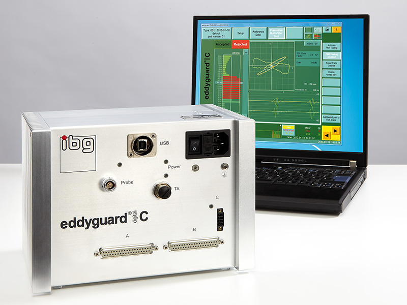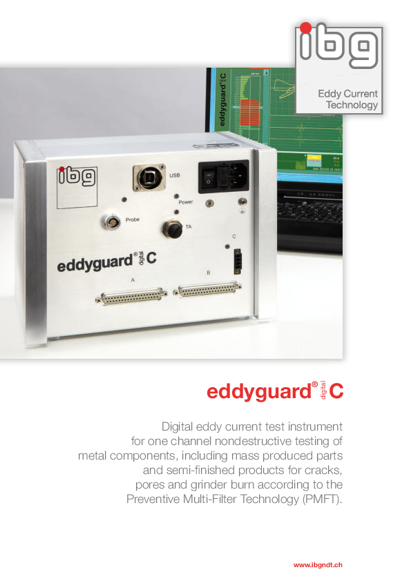 ibgs’ eddyguard C ibgs’ eddyguard C distinguishes itself with a compact no-screen design and concentration on one-channel crack and grinder burn detection with one probe and combines that with the well-known ibg test reliability and ease of operation. This digital eddy current test instrument is designed for one-channel nondestructive testing of metal components, including mass-produced parts and semi-finished products for cracks, pores, and grinder burn according to the Preventive Multi-Filter Technology (PMFT).